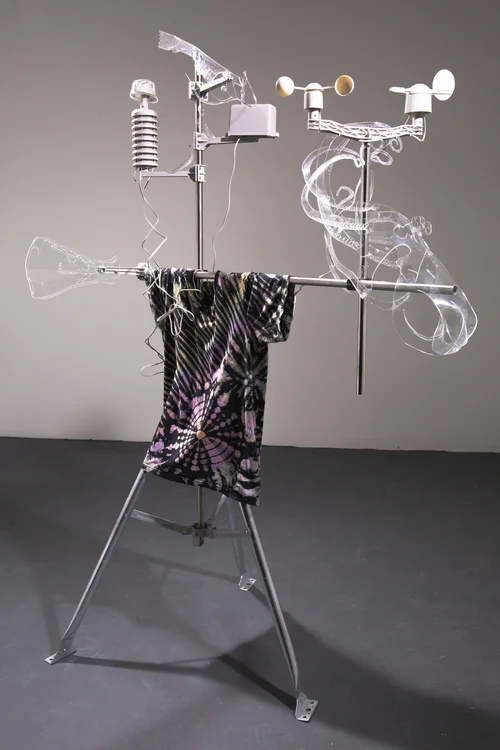Climate sensors, clear acrylic, stainless less steel tube, tripod, tie-dye t-shirt